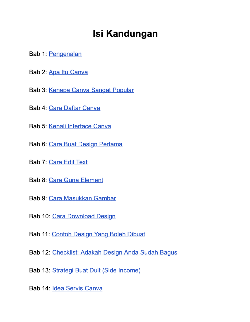 eBook ini bukan sekadar teori. Ia adalah panduan praktikal yang disusun khas untuk beginner yang nak kuasai Canva dari zero sampai boleh buat duit.